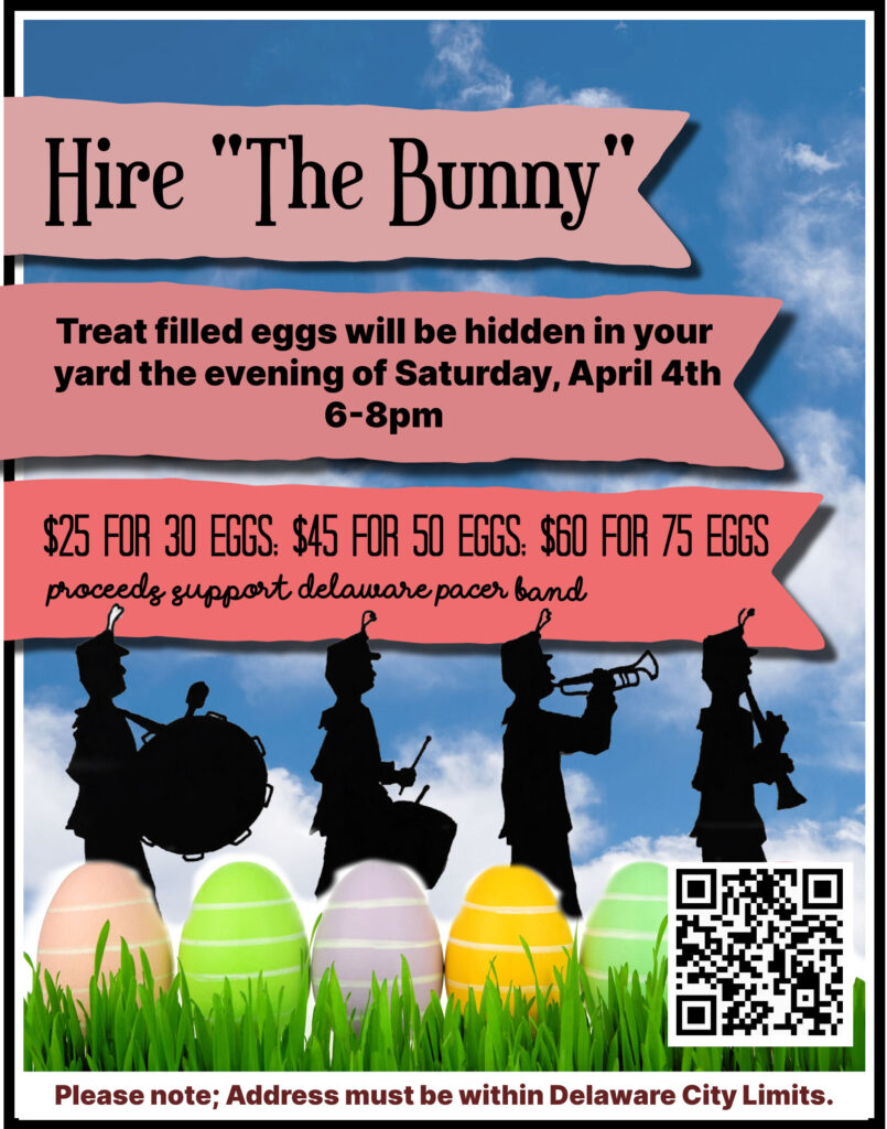 Back by popular demand, the talented students of the Delaware Hayes High School Pacer Bands are offering their Hire The Band Bunny service again. They’ll hop over to your yard the night before Easter—Saturday, April 4, 2026, between 6-8 p.m. and expertly hide treat-filled Easter eggs for your kids (or grandkids, nieces/nephews, etc.) to discover on Easter morning.